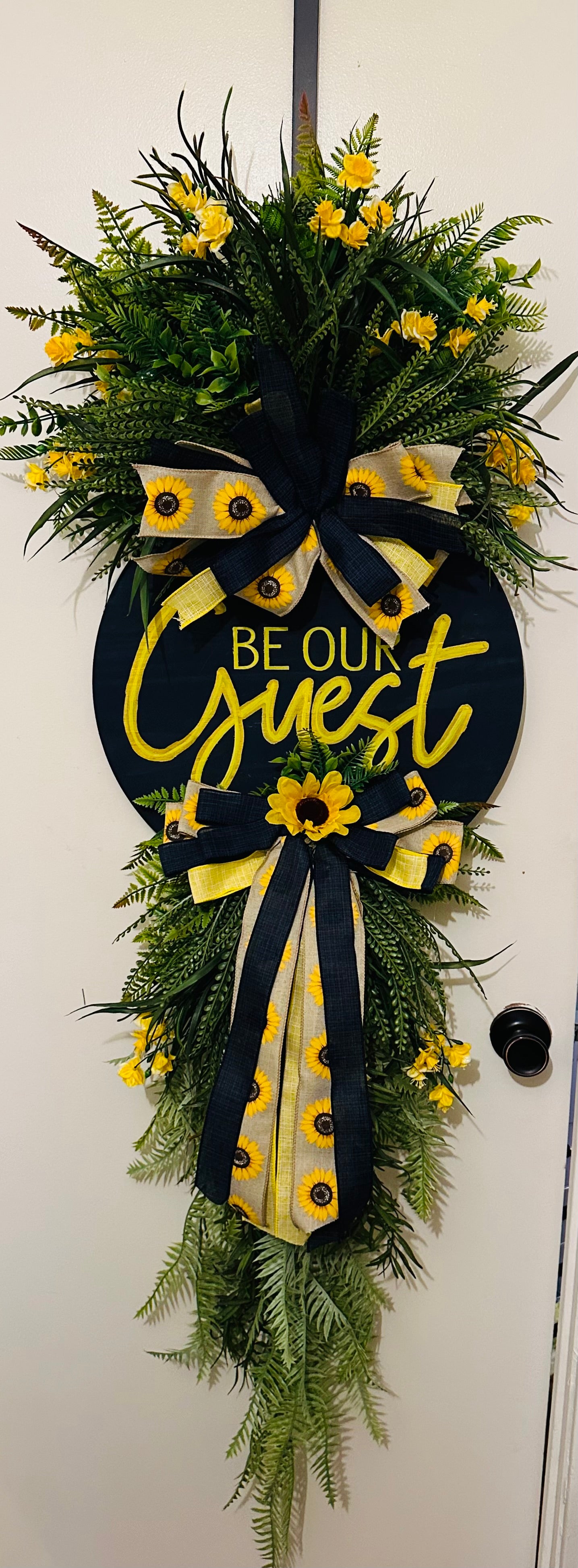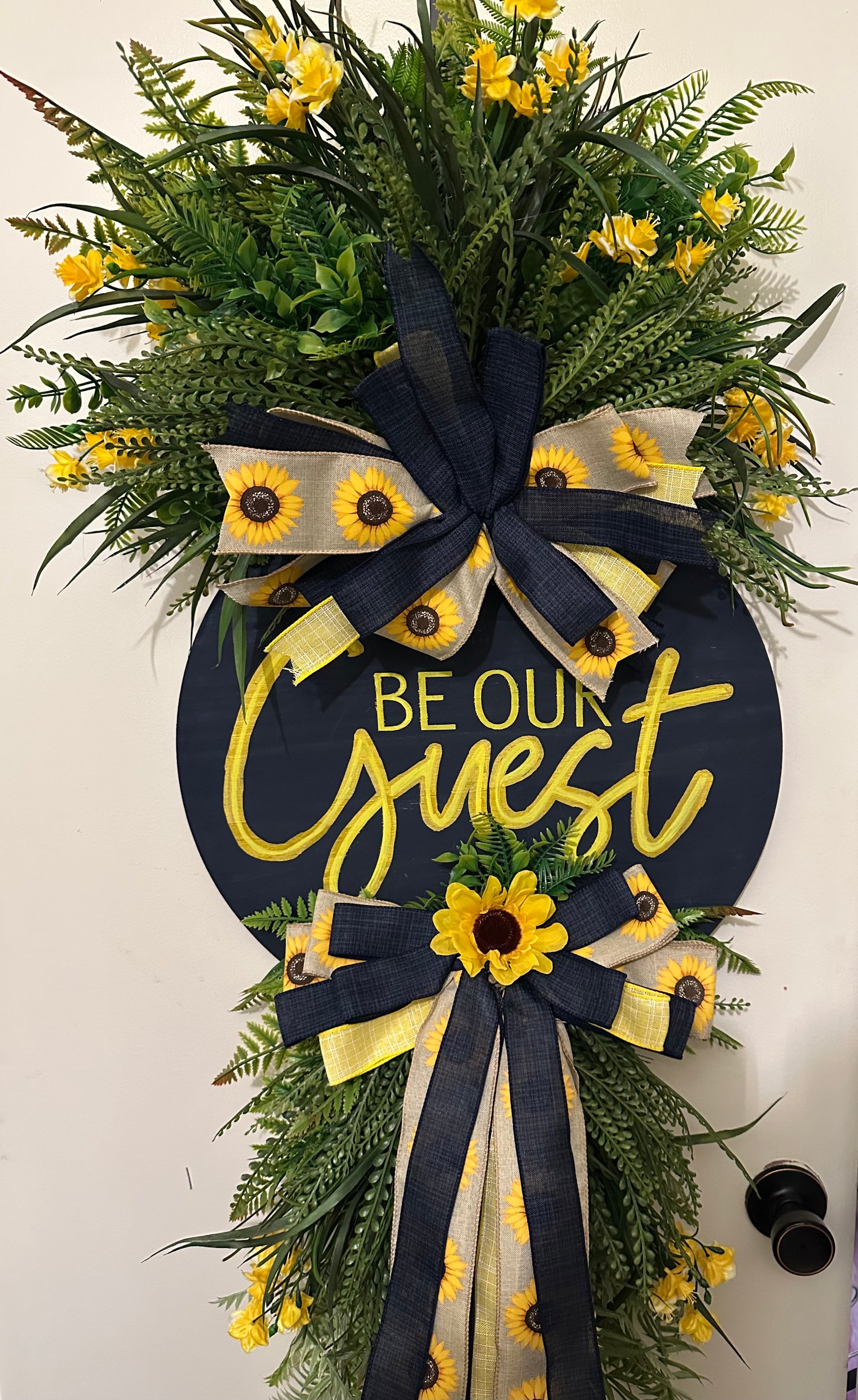 CUSTOM YELLOW AND NAVY BLUE DOOR SWAG WITH FLOWERS AND GREENERY