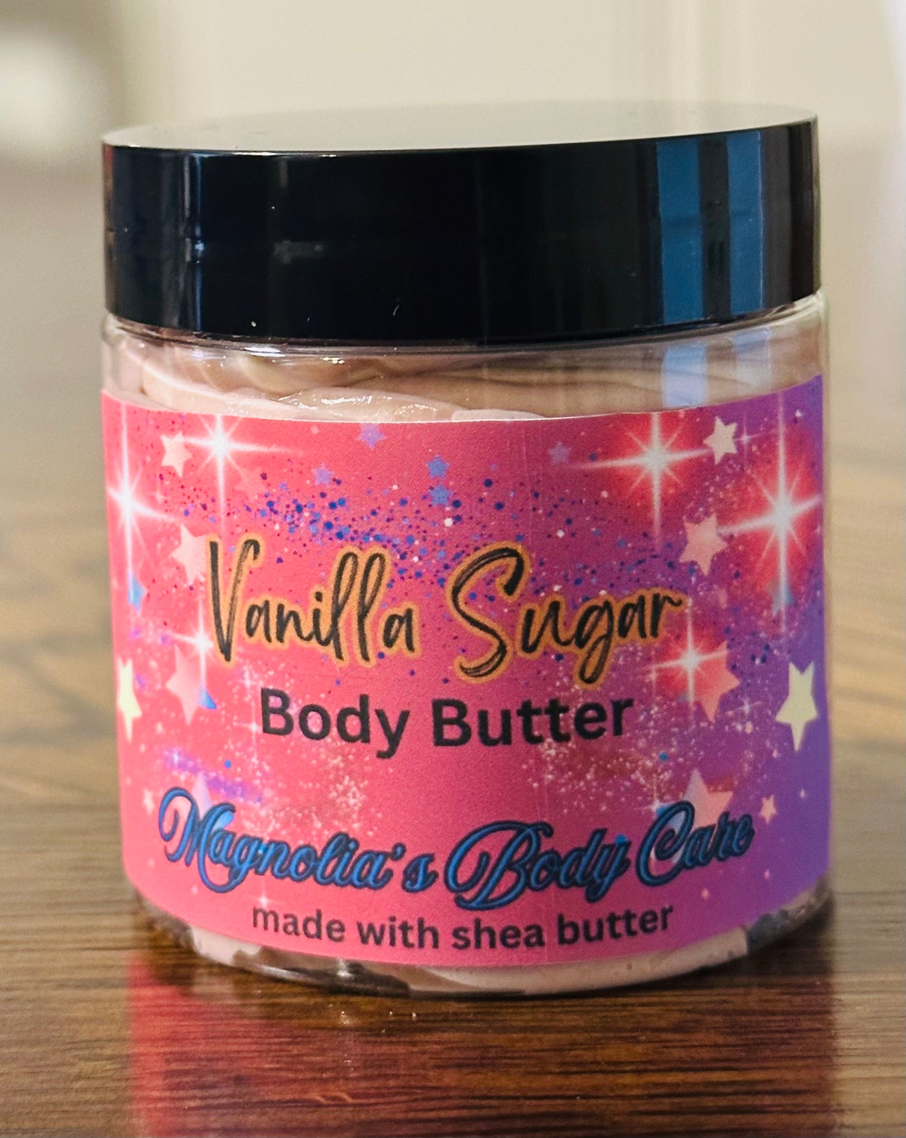This body butter is made with shea butter, vitamin E oil, and some otehr ingredients similar to otehr store brought lotions with fragrances. This is a 4 oz bottle.